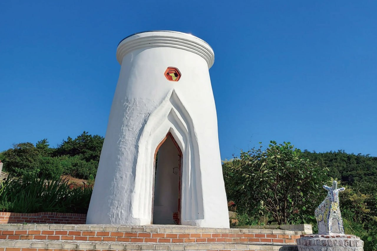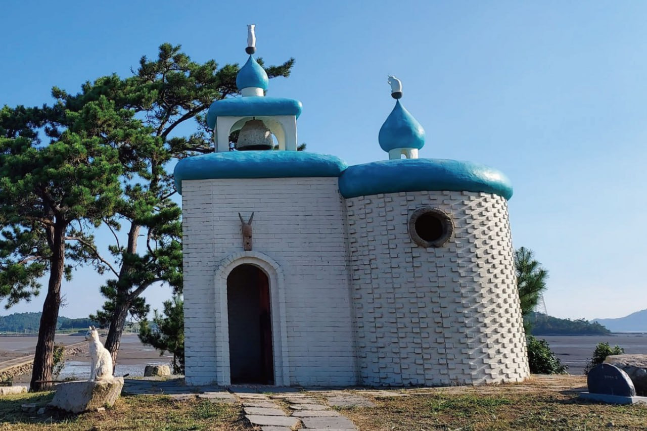 순례길의 시작점인 대기점도 선착장에는 ‘건강의 집’이라는 이름의 예배당이 방문객을 맞는다. 새하얀 회벽과 푸른 돔 지붕으로 이국적인 인상을 주며, 그리스 산토리니를 연상시키는 외관이 바다 풍경과 조화를 이룬다.