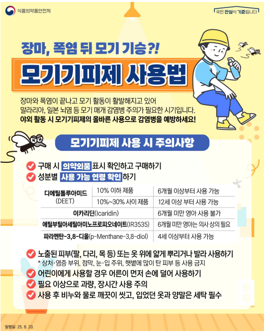 식품의약품안전처는 20일 ‘세계 모기의 날’을 맞아 모기 기피제의 올바른 사용법과 주의사항을 안내했다. 대표적인 유효 성분으로는 ▲디에틸톨루아미드(DEET) ▲이카리딘 ▲에틸부틸아세틸아미노프로피오네이트(IR3535) ▲파라멘탄-3,8-디올(PMD) 등이 있으며, 성분 농도에 따라 사용 가능 연령이 다르다.