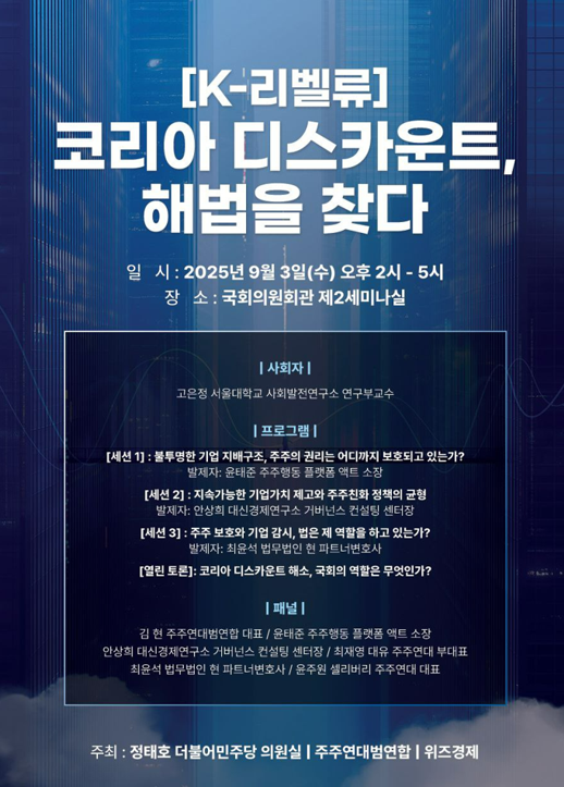 [위즈경제] 류으뜸 기자 =정태호 더불어민주당 의원실은 오는 9월 3일(수) 오후 2시 국회의원회관 제2세미나실에서 [K리벨류] ‘코리아 디스카운트, 해법을 찾다’를 주제로 국회정책 토론회를 개최한다.