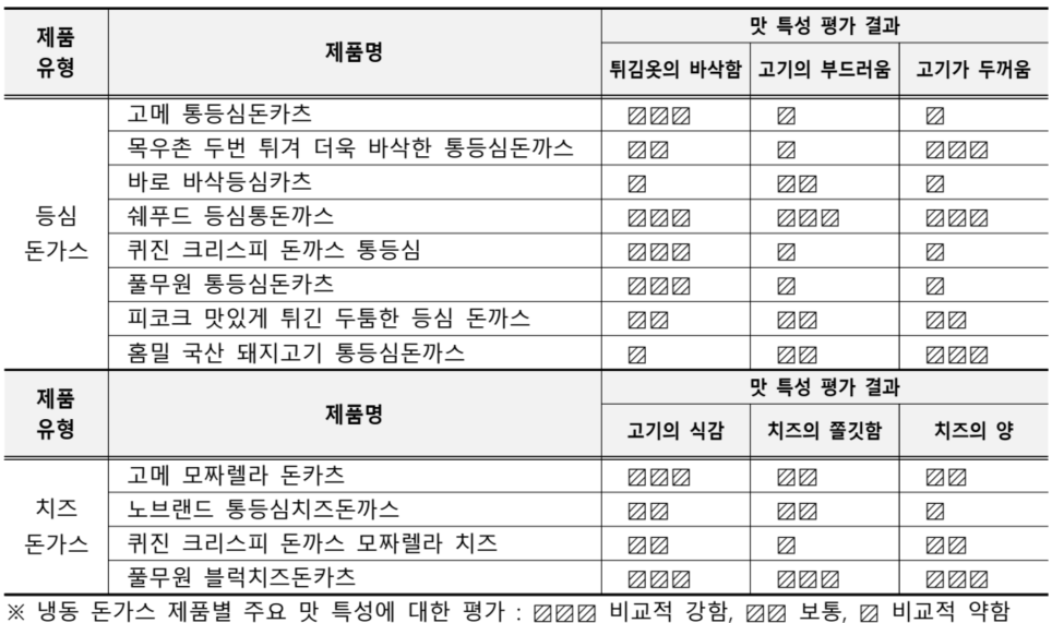 CJ제일제당 ‘고메 통등심돈카츠’와 동원F&B ‘퀴진 크리스피 돈까스 통등심’, 풀무원 ‘통등심돈카츠’도 바삭한 튀김옷으로 긍정적인 평가를 얻었다. 치즈 돈가스 중에서는 풀무원의 ‘블럭치즈돈카츠’가 치즈의 쫄깃함과 양에서 두드러졌고, 고기의 식감도 강점으로 꼽혔다. 반면 일부 제품은 기름짐이 강하게 나타나 담백한 식감을 원하는 소비자는 제품별 특성을 확인할 필요가 있다.