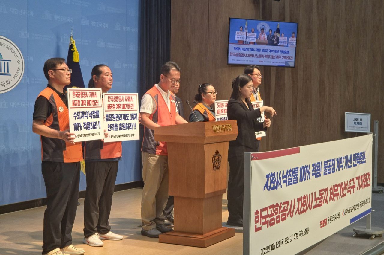 기자회견에 참석한 김포공항 근무 노동자는 “한국공항공사는 KAC공항서비스, 남부공항서비스, 한국항공보안이라는 자회사를 통해 공항의 시설·전기·건축·토목·보안·주차·카트 등 공항 운영 전반을 담당하면서도 여전히 자회사를 용역업체처럼 취급하고 있다”며 “자회사 노동자들은 불공정 계약과 낮은 인건비, 인력 미충원과 권리 제한 속에 고통받고 있다”고 말했다.