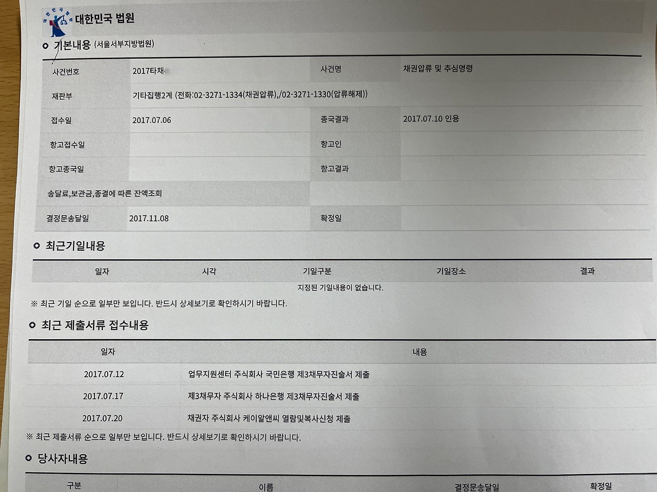 본지가 확보한 법원 문서. 케이알앤씨는 2013년 A씨를 상대로 2016년 약 314만원에 대한 지급명령채권압류를 신청했고 법원은 이를 인용했다. 사진=롤링주빌리
