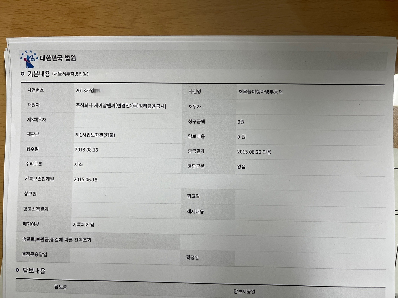 본지가 확보한 법원 문서. 케이알앤씨는 2013년 A씨를 상대로 채무불이행자명부 등재를 신청했고 법원은 이를 인용했다. 사진=롤링주빌리