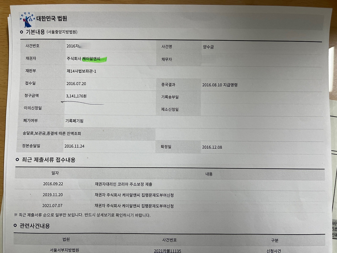 실제 본지가 확보한 법원 기록에 따르면 케이알앤씨는 2013년 A씨에 대해 채무불이행자명부에 등재해달라는 신청을 했고 법원은 같은 해 8월 이를 받아들었다. 2016년에는 A씨에게 314만원의 지급명령이 내려졌고 다음해 A씨의 통장에 대한 압류까지 허용했다. 2021년에도 케이알앤씨는 A씨를 채무불이행자 명부에 다시 등록해달라고 신청했고 법원은 이를 또 받아들였다.