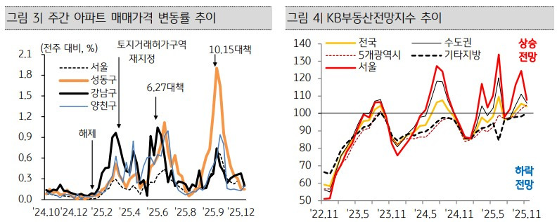 다만 상승의 ‘온도’는 확연히 낮아졌다. 토지거래허가구역으로 신규 지정된 서울 강남·마포·성동, 경기 분당·과천 등 주요 지역의 아파트 가격 상승률은 대책 발표 전후로 급격히 둔화됐다. KB부동산전망지수 역시 수도권을 중심으로 상승 기대가 빠르게 후퇴하며 관망 심리가 확산되고 있다.
