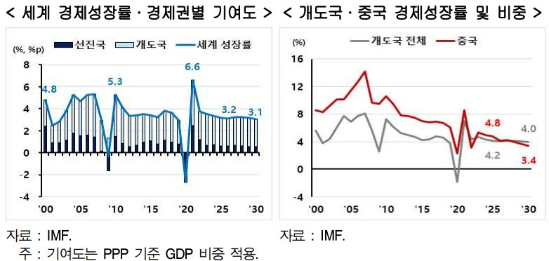 세계 경제 성장률은 장기적으로 하락 추세를 보이고 있다. 선진국은 이미 구조적 저성장 국면에 진입했고, 개도국 역시 과거와 같은 고성장을 기대하기 어려운 상황이다. 보고서에 따르면 글로벌 평균 성장률은 팬데믹 이후 일시적으로 반등했지만, 중장기적으로는 다시 둔화 국면에 접어들 가능성이 크다.