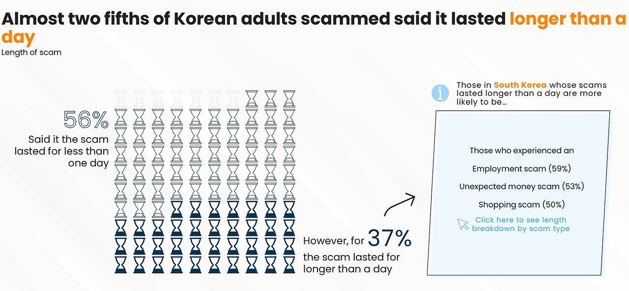 보고서는 이러한 사기 경험이 단기간에 끝나지 않는 경우도 많다고 지적한다. 투자사기와 사칭사기가 결합된 사례일수록 피해 기간이 길어지는 경향을 보인다. 피해자가 스스로 사기임을 인지하는 데 시간이 걸리기 때문이다. 이 역시 개인의 판단 문제가 아니라, 사기의 구조적 완성도를 보여주는 지표다.