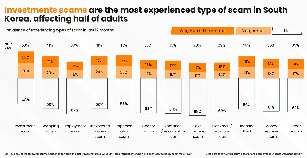 한국에서 가장 흔하게 발생하는 사기 유형은 무엇일까. 보고서는 명확한 답을 제시한다. 투자사기(50%)와 사칭사기(43%)다.